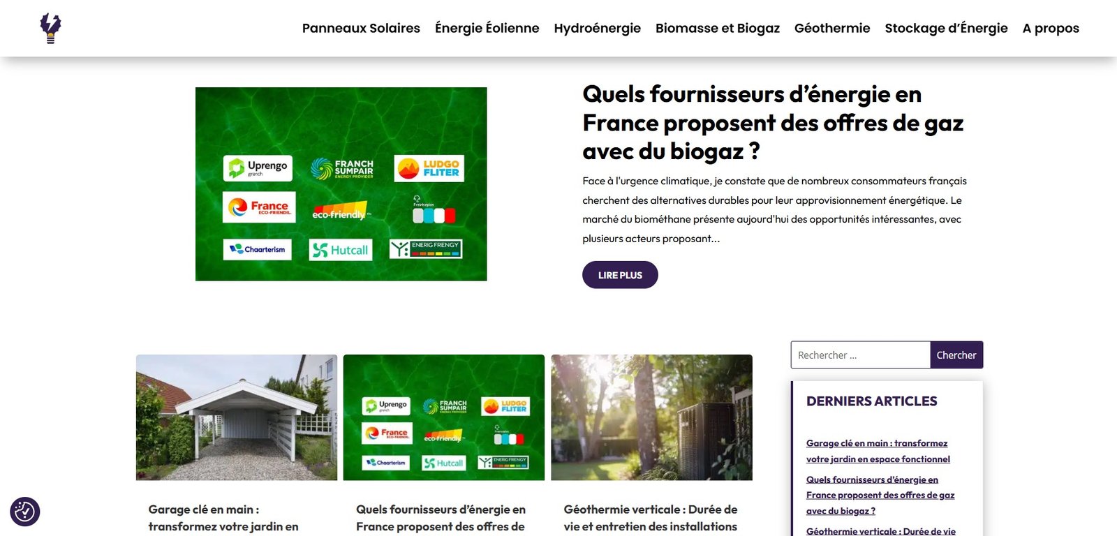 Le site traite plusieurs thématiques liées aux énergies propres, notamment les panneaux solaires, l’énergie éolienne, l’hydroénergie, la biomasse et le biogaz, la géothermie ainsi que les solutions de stockage d’énergie. Ces rubriques permettent d’explorer les technologies utilisées pour produire et conserver une énergie plus durable.