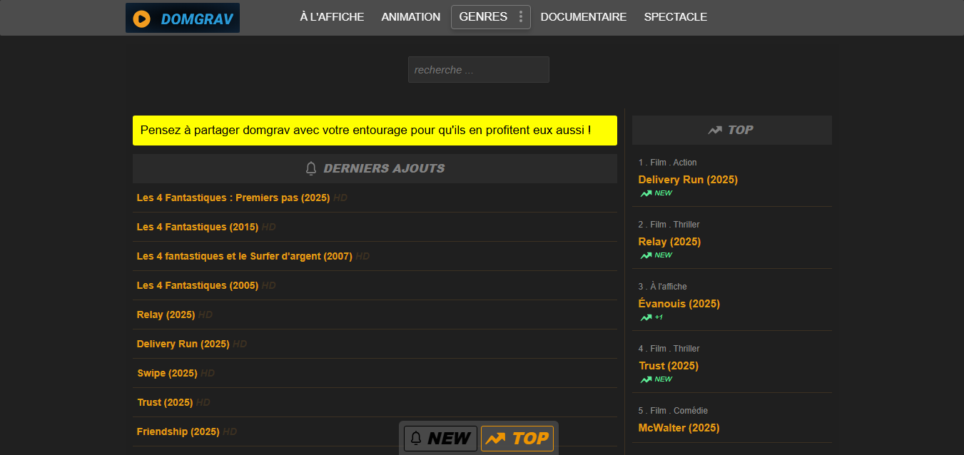 En plus des films et des séries, Domgrav a aussi d’autres types de contenus. Vous pouvez y regarder des documentaires, des spectacles, ou des films d’animation, aussi appelés animés. Le site ajoute souvent de nouveaux films et séries pour que vous permettre de toujours avoir de la nouveauté. Les films gratuits sont disponibles en qualité HD pour une meilleure expérience visuelle. Cela signifie que les images sont très belles et très nettes. Vous avez même la chance de découvrir certaines exclusivités. Tout est conçu pour vous permettre de regarder ce que vous aimez facilement et sans frais.