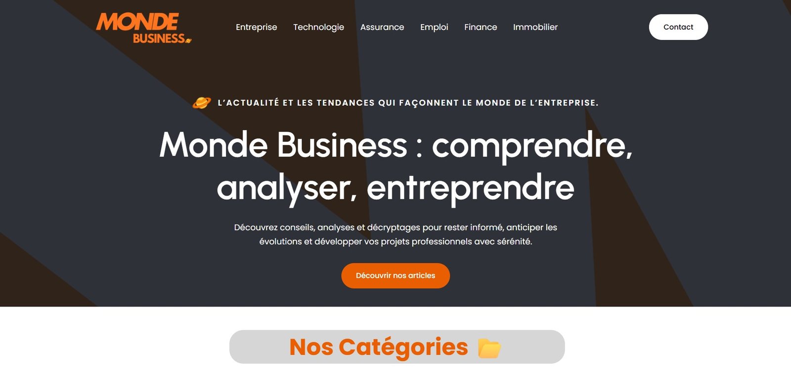 Le site s’articule autour de plusieurs rubriques majeures — Entreprise, Technologie, Assurance, Emploi, Finance et Immobilier — qui couvrent les enjeux essentiels de la vie professionnelle.