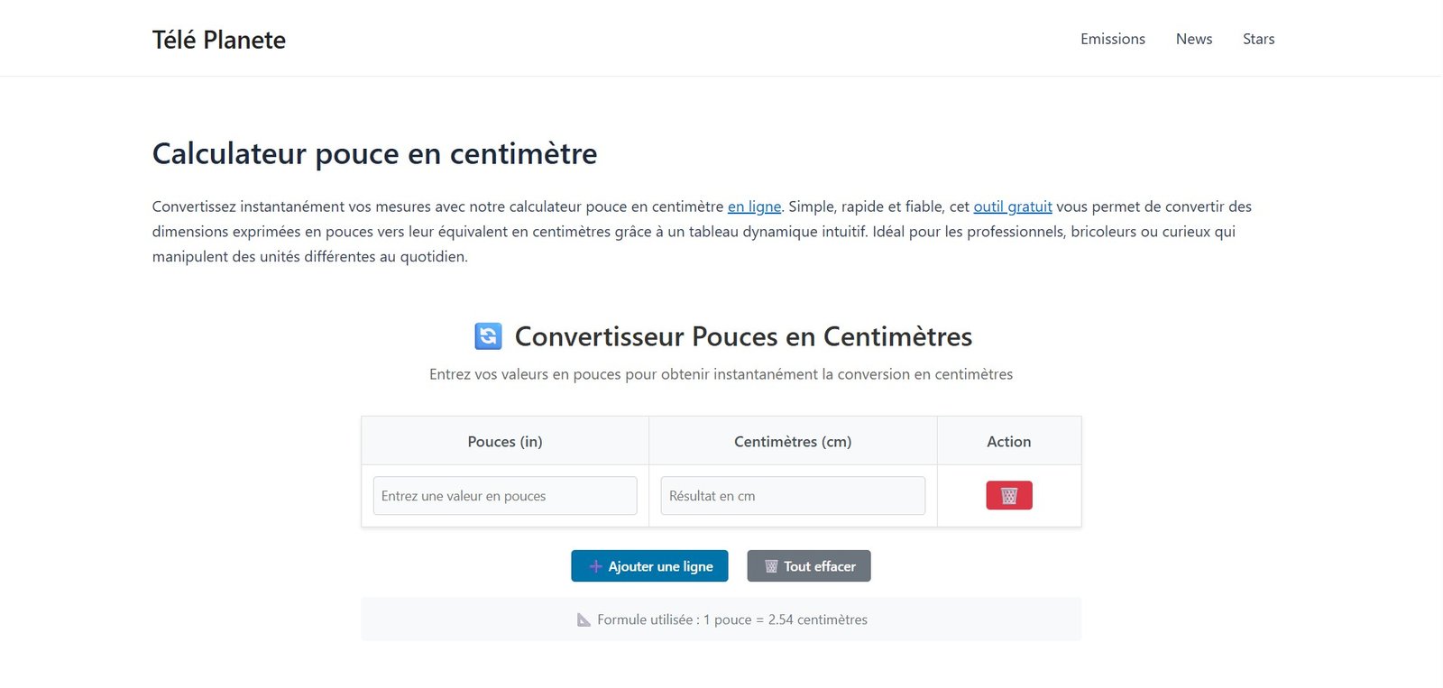 Sur Teleplanete.com, vous trouverez un calculateur de conversion pouces ↔ centimètres qui rend l’utilisation de la formule encore plus rapide et accessible. Ce type d’outil interactif est particulièrement utile si vous n’avez pas de calculatrice sous la main.